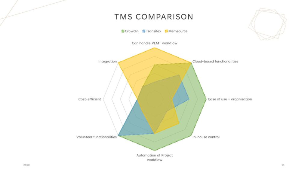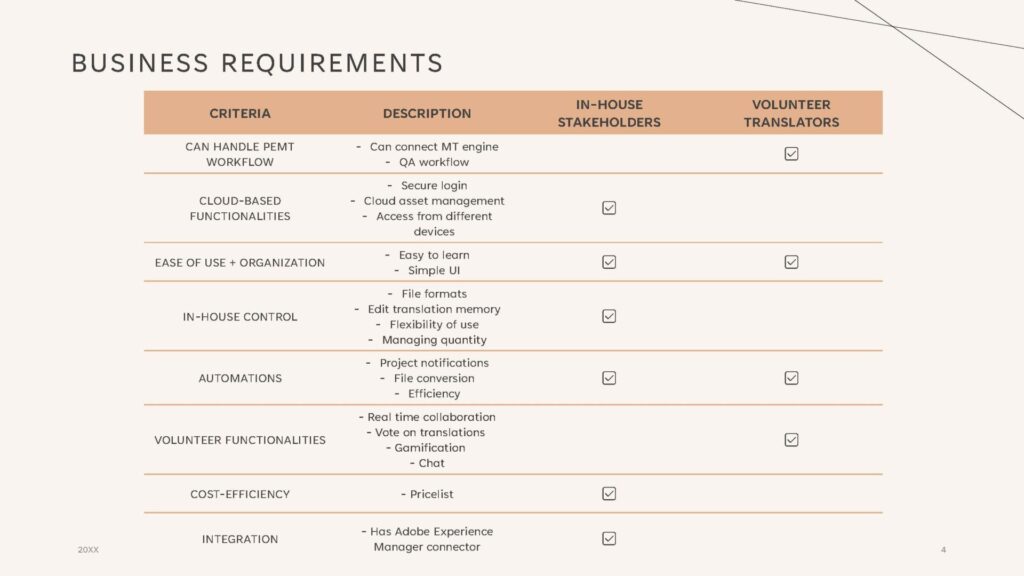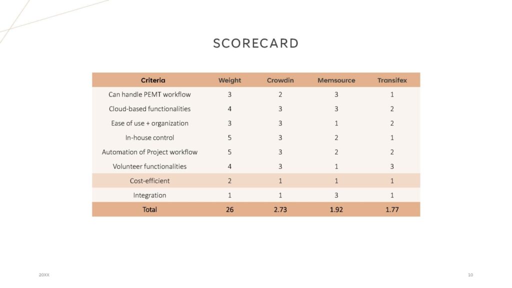 Next, we gathered our knowledge of the Red Cross’s translation needs from a business and linguistic perspective to determine the criteria used to analyze TMSs. We also put weights on the criteria depending on how important it was to the organization’s goals.