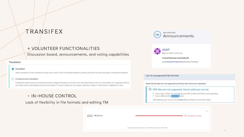 We found Transifex, Memsource, and Crowdin to be the most plausible TMS choices. We conducted a simple pilot project of translating a Word document to test out their functionalities and score the features that met the criteria we put forth.